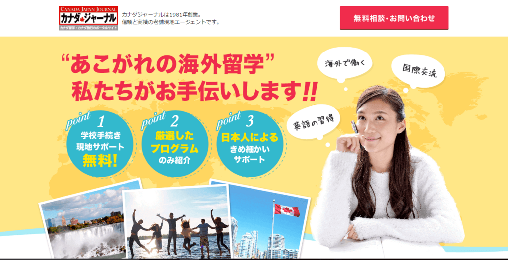 カナダジャーナルはなんといっても長年の信頼と実績があり、現地での部屋探しや銀行口座の開設など様々な相談が無料で受けられます。