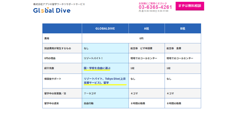 >>【0円留学】国内ワーホリ経由≫海外留学行き|留学貯金0円&英語力0の留学希望者を徹底サポートするのが「Global Dive」です。
